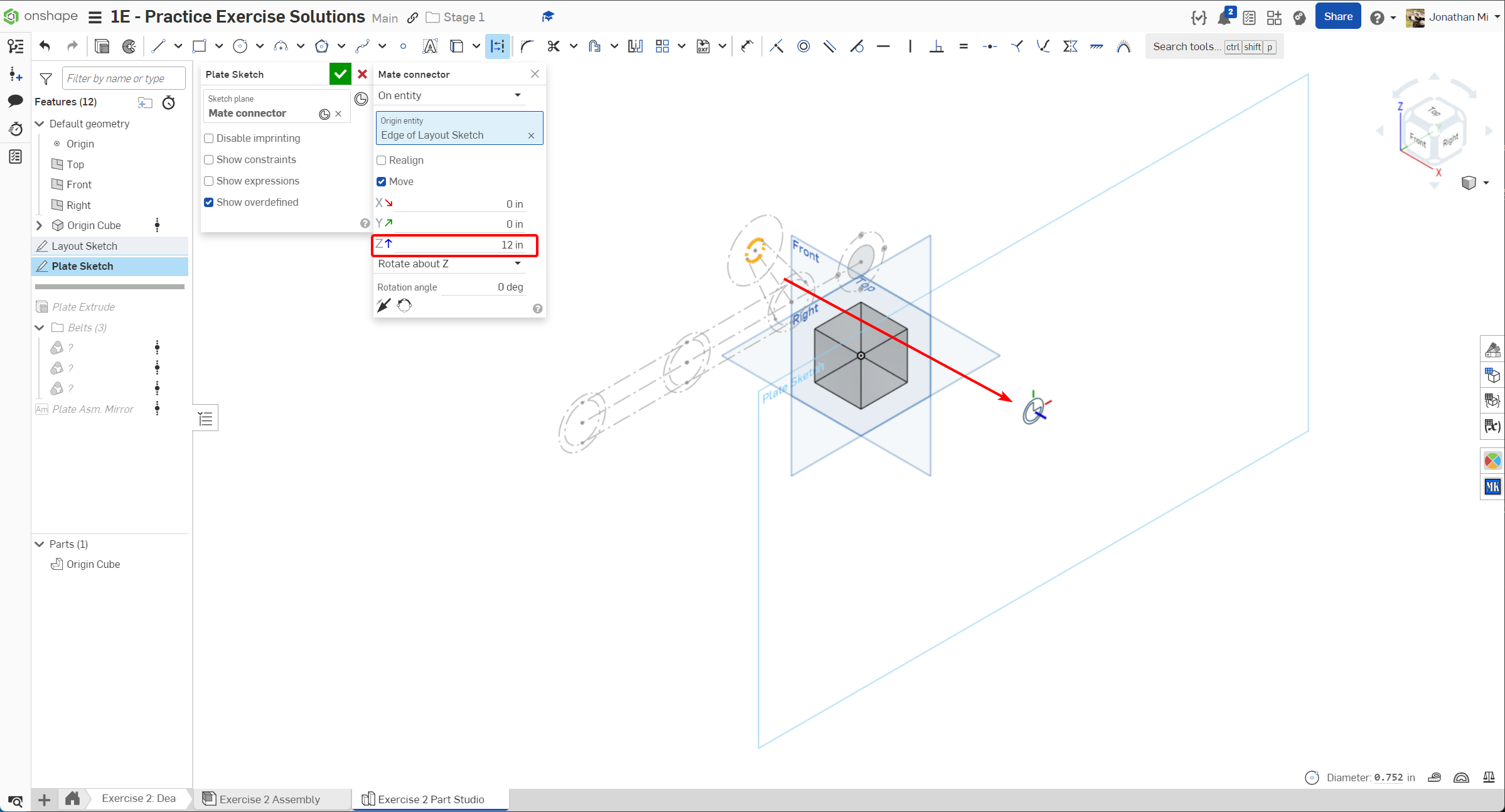 7. Create the plate sketch by using an offset mate connector from the layout sketch as the origin entity. Select the motor pulley and offset by 12".