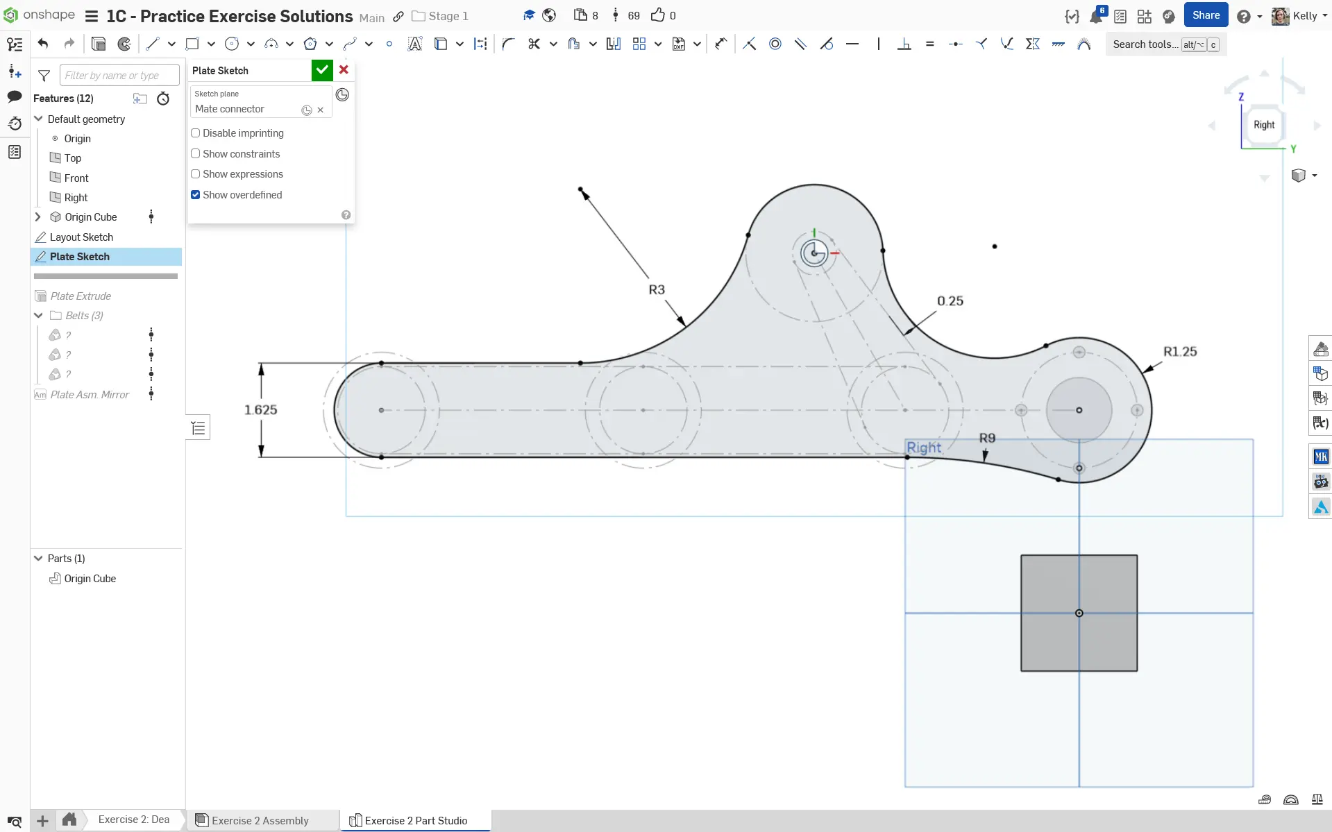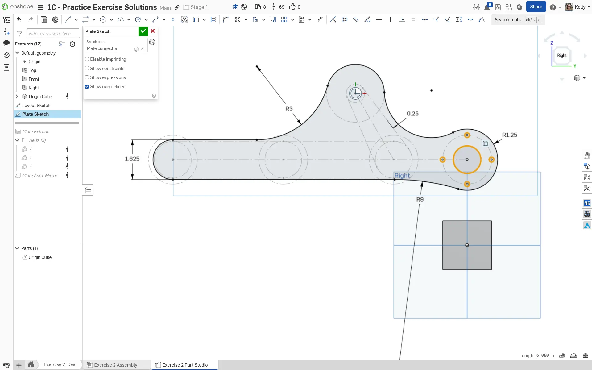 8. Sketch the plate outline. Pay attention to the sketch constraints in the solutions document. We offset the curve on the top right 0.25" away from the belt to that it is fully covered by the plate.