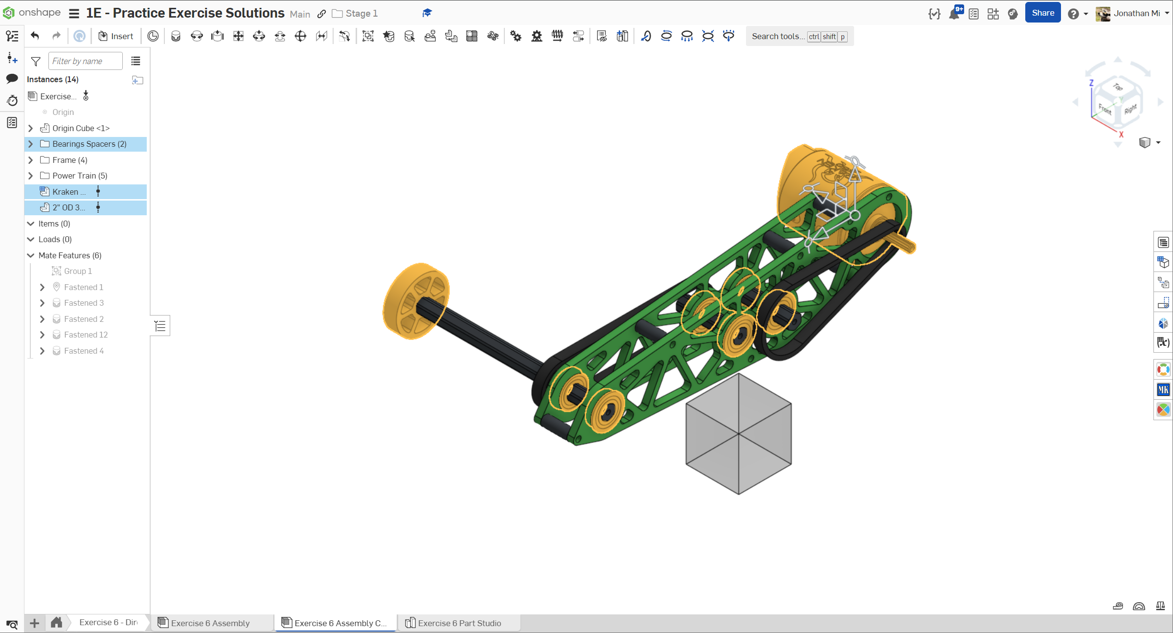 So far, you've used both custom spacers generated with the Spacer Featurescript as well as COTS 3/8" OD spacers from the MKCad library (the WCP Aluminum Spacers).