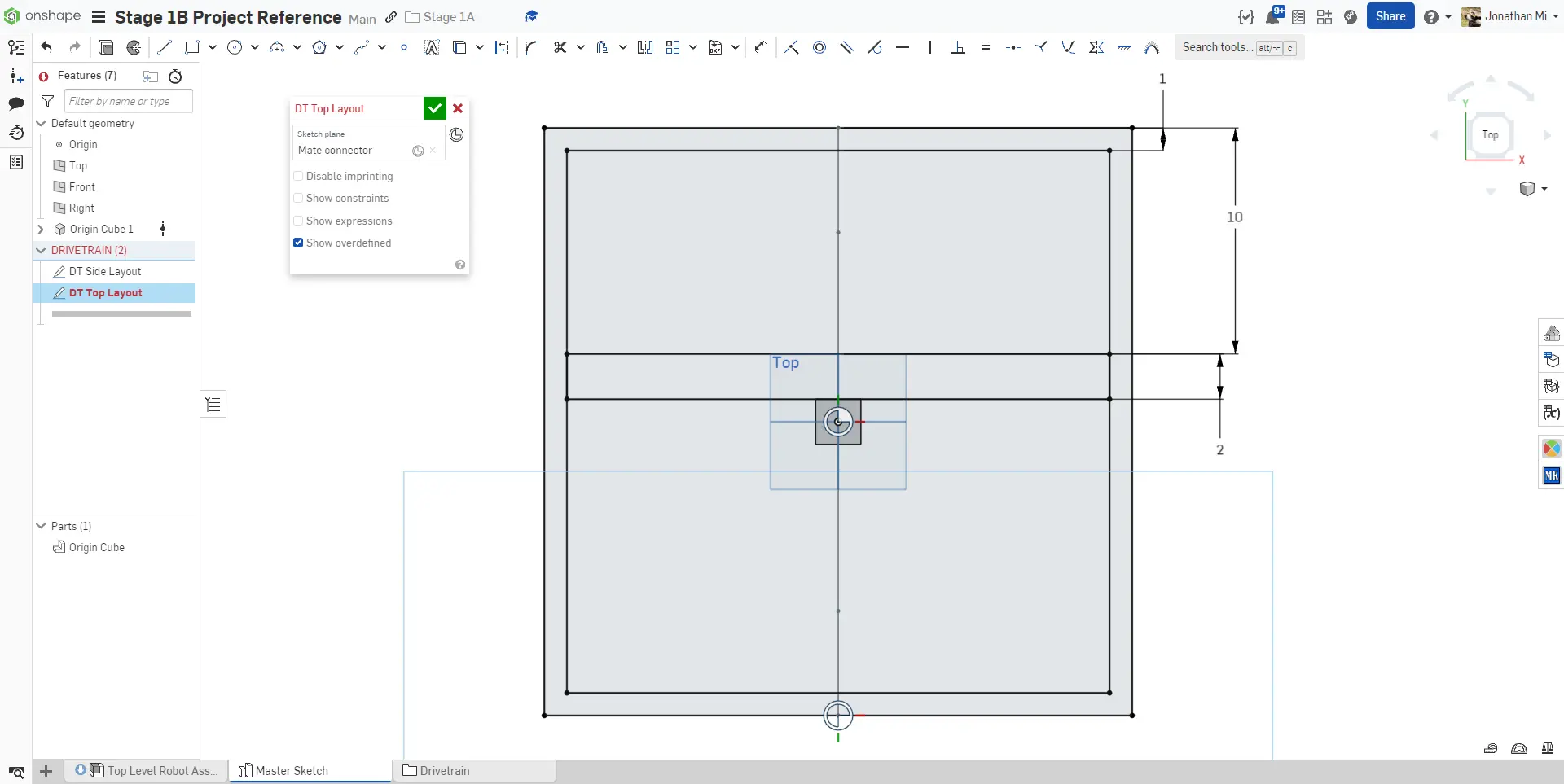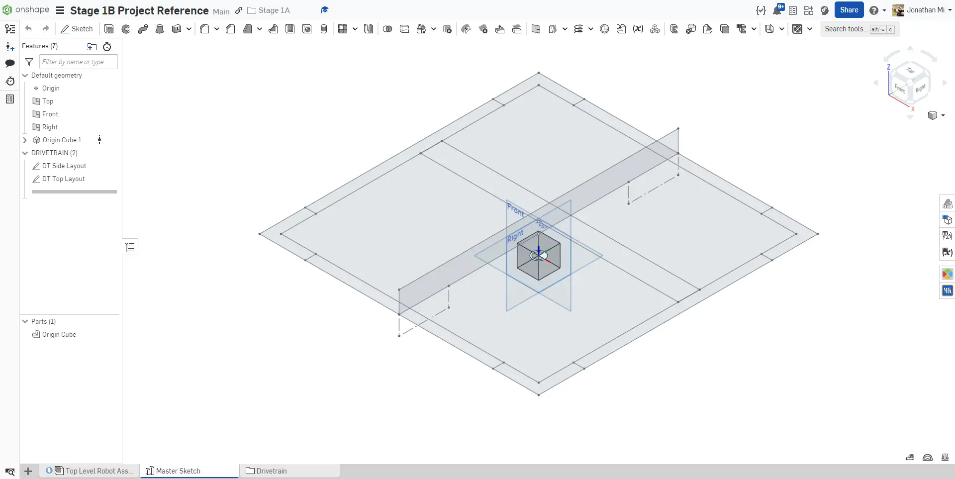 Start by creating a new Onshape Document called Stage 1D Robot and within it, a new part studio called Main Layout Sketch. Then, use the Origin Cube Featurescript to create an origin cube. Follow the instructions in the slides to complete the layout sketch.
