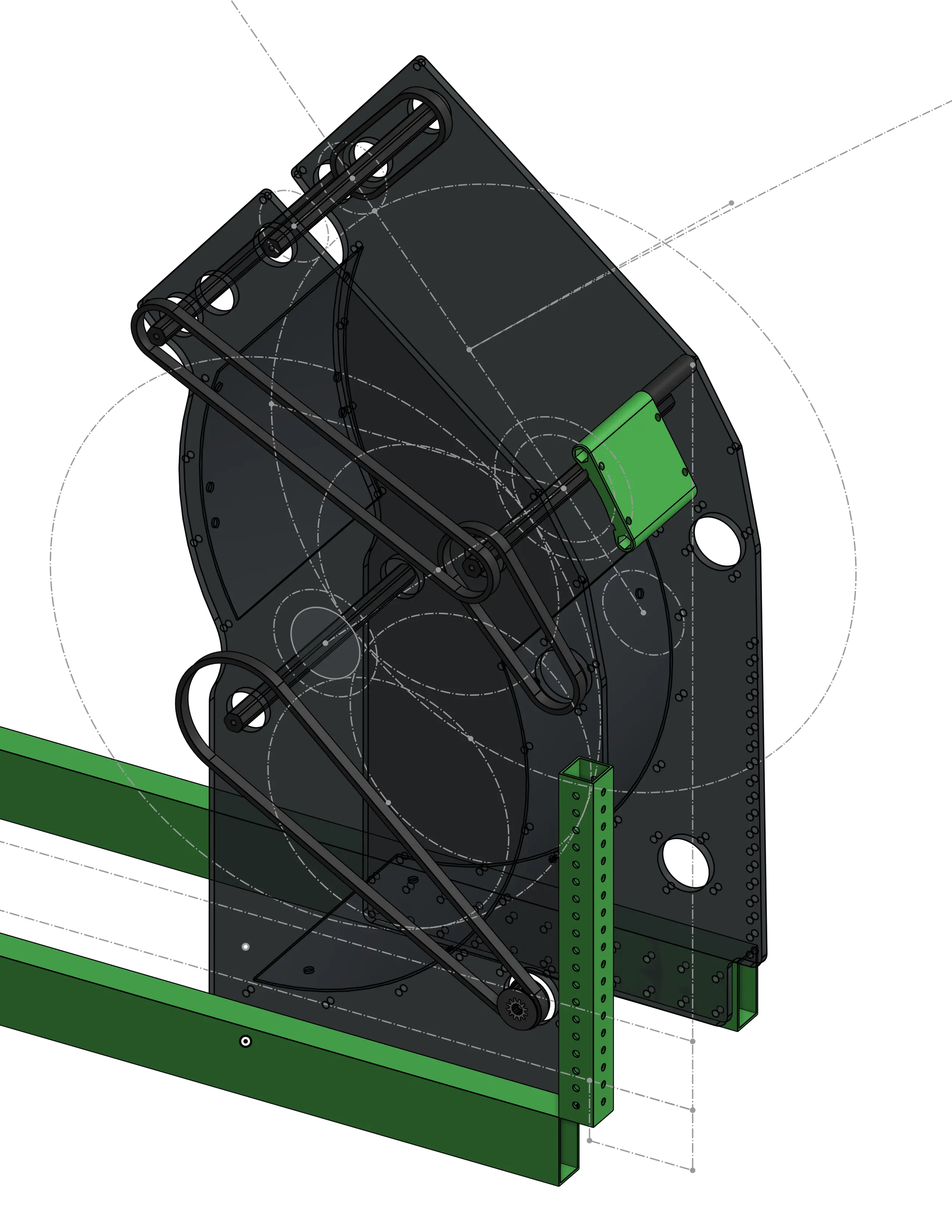 - Model your main plate on the inside of the cross rails, sketching mounting hardware holes first, including standoffs to hold the bent polycarb following the edge of the large ball path circle concentric to the feeder wheels, then power transmission (motors, belt center-to-center lines, gear pitch circles), then finally the plate outline. Similar to sketching a large gearbox, isn't it? Make sure to extrude it and mirror it for parametric reference for other parts.