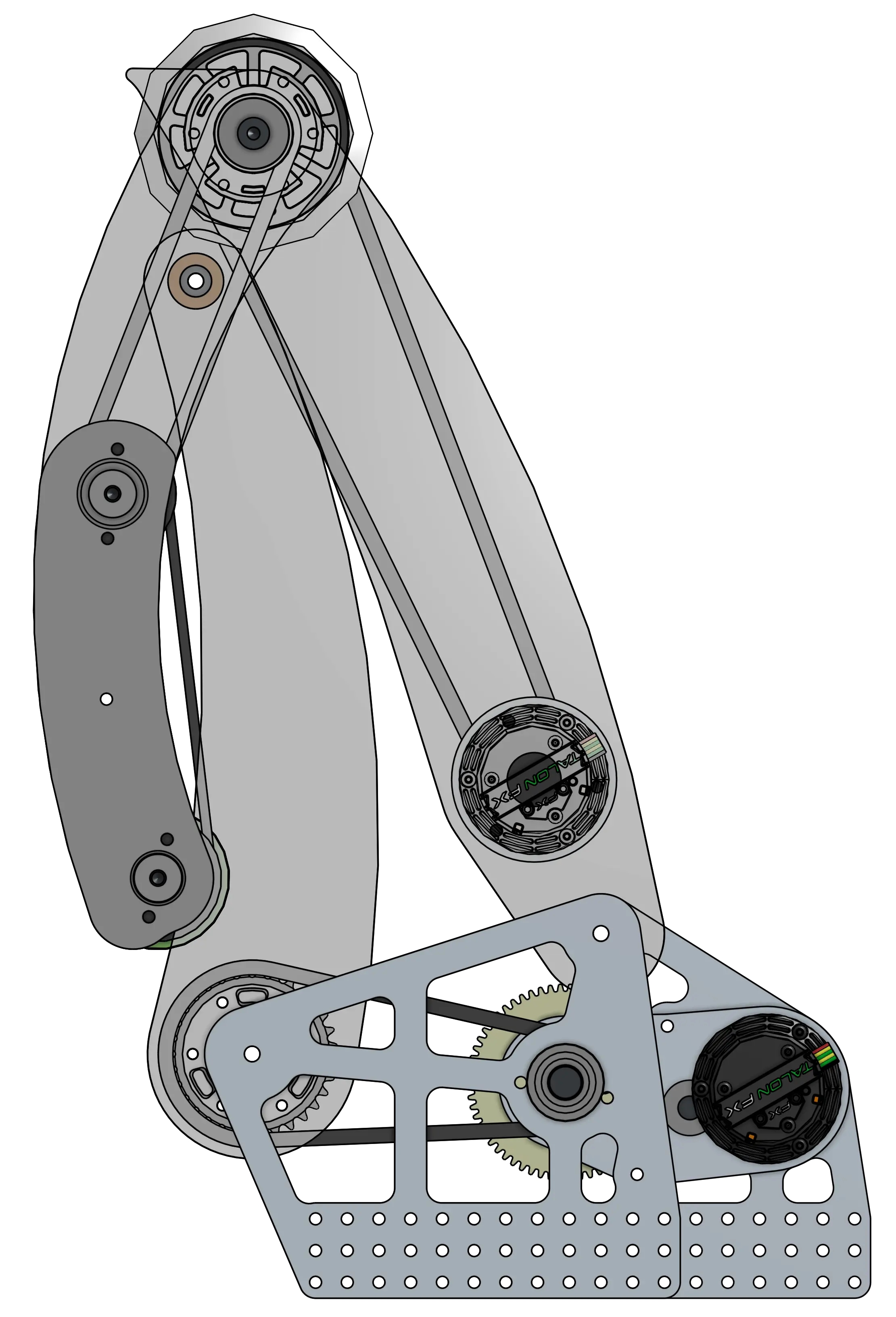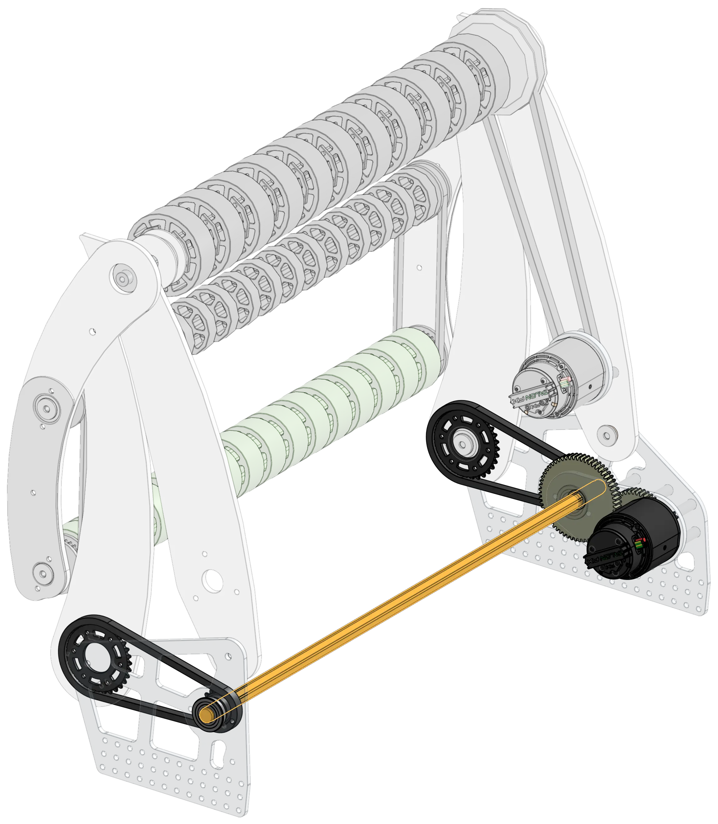 OTB intakes must actuate quickly and accurately, so a motor is a good choice to power them. 1678 used a single Falcon 500 with a 30:1 ratio. This intake featured a torque transfer shaft (highlighted yellow in the image) to transfer power to both sides of the intake. Driving both sides of the intake pivot prevents the entire intake from bending under the loads of extension and retraction. The pivot itself is driven by chain on a 32t plate sprocket. Using a chain for the final reduction and power transmission is optimal due to its ability to absorb shock loads.